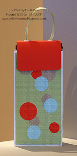 I’ve used the inlaid embossing technique on a piece of Certainly Celery then attached it to a white paper bag – the back has the same design. I then added some Poppy Parade to make the flap. This is held down by a magnetic strip. Inside the bag are four coffee sachets – a quick birthday or thank you gift.