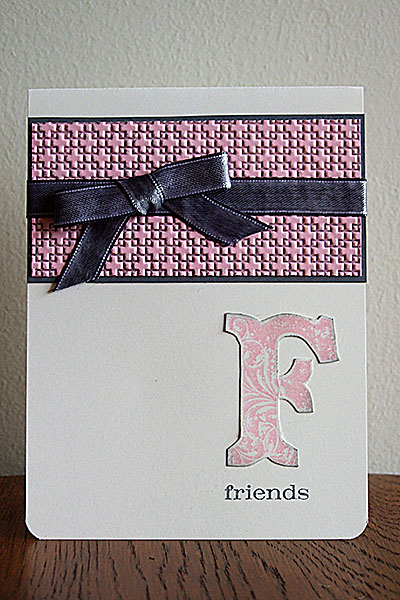 I have a vey special friend and I have wanted to send her a card for ages just letting her know how special she is to me.   When I saw Paula Dobson’s project on U Stamp with Dawn & Friends I fell in love with it & have been wanting to trial it.  Well here it is.  I used the colour combination fromSPCC.  I first tried brayering in Pretty In Pink on the Grey but it didn’t show up so I brayered in Grey on the Pink.  I only have the ink spot of Grey – do you know how hard it is to ink your brayer with an ink spot instead of rolling on a big ink pad – not that easy.  I guess there’ll be more ink pads on my wish list!  I didn’t have any grey ribbon so I sponged some white with the grey ink.  To make the envelope on the inside I cut out two scallop envelopes – one in pink paper & the other in grey (just the top portion) and stuck them together.  The other side of the pink paper was to ‘loud’ for the card.  The rest of the voucher reads ‘to one full body massage’  I’m really pleased with the final product.