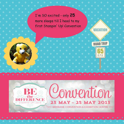 Over at the NZSU blog Callena has given us a challenge to use Melon Mambo, Daffodil Delight and Tempting Turquoise on a page or card. The twist with this challenge is that we must use MDS (the new digital programme from Stampin Up) to create our project. I have combined this challenge with one we have on our demo forum to create a page saying how many more sleeps it is till Convention. Today was my day with only 25 more sleeps to go – I can’t wait as this will be my first convention (very exciting). So what do you think of my second attempt at MDS? I’ve gone with a fun layout.