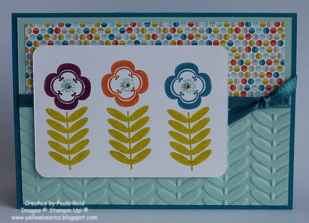I’ve used four things from the catalogue – DSP, stamp set, ribbon and an embossing folder.  I can’t remember where I CASED this card from but whoever originally created it – thanks for sharing 🙂