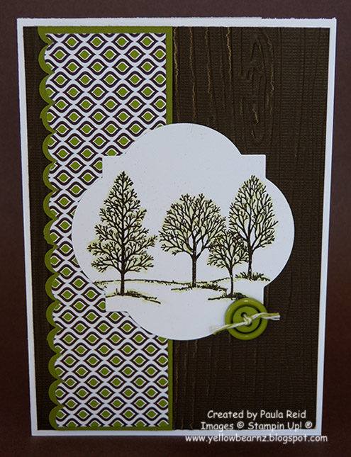 Other – Woodgrain Embossing Folder, Window Collection Framelits, Early Espresso Embossing Powder, Old Olive Crayon, Blender Pen, Scallop Edge Border Punch,Old Olive Button, Lucky Limeade Bakers Twine