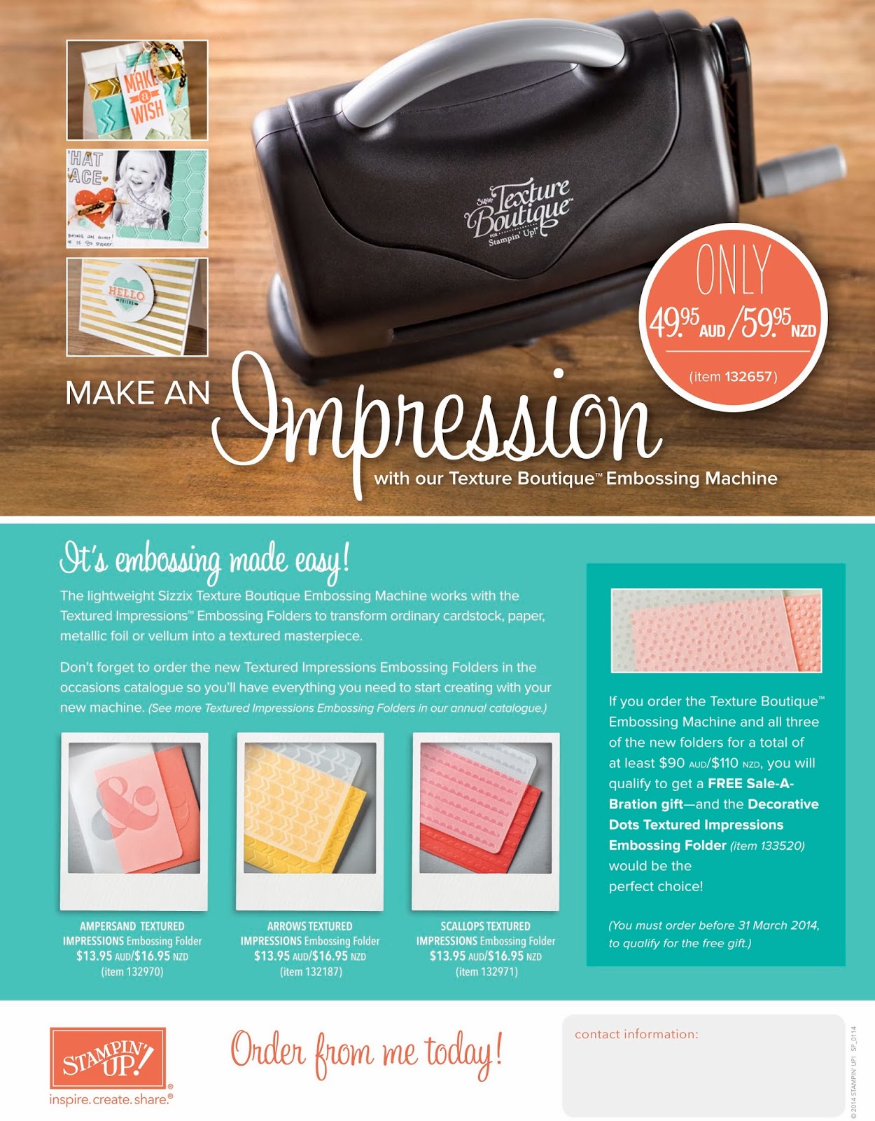It’s embossing made easy. The Texture Boutique is the perfect, portable tool to create embossed cards, tags, embellishments and more. Use it with our Stampin’ Up! exclusive Textured Impressions Embossing Folders. This portable machine only embosses – it does not cut. It comes with two plates and a shim. This is a great tool to have if you love to emboss. If you would like to purchase one of these at only $59.95 please email me. There are only a limited number available at the moment – so once those sell out you’ll have to wait until the new annual catalogue comes out in July.