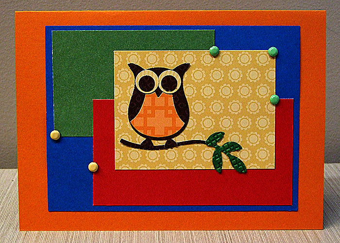 I haven’t done any stampng on this card – just used colour, punches & embellishments. The owl is made out of DSP and I’ve run the leaf through the Square Lattice Embossing folder for some texture. The background cardstock is actually Pacific Point but it looks brighter in the photo.